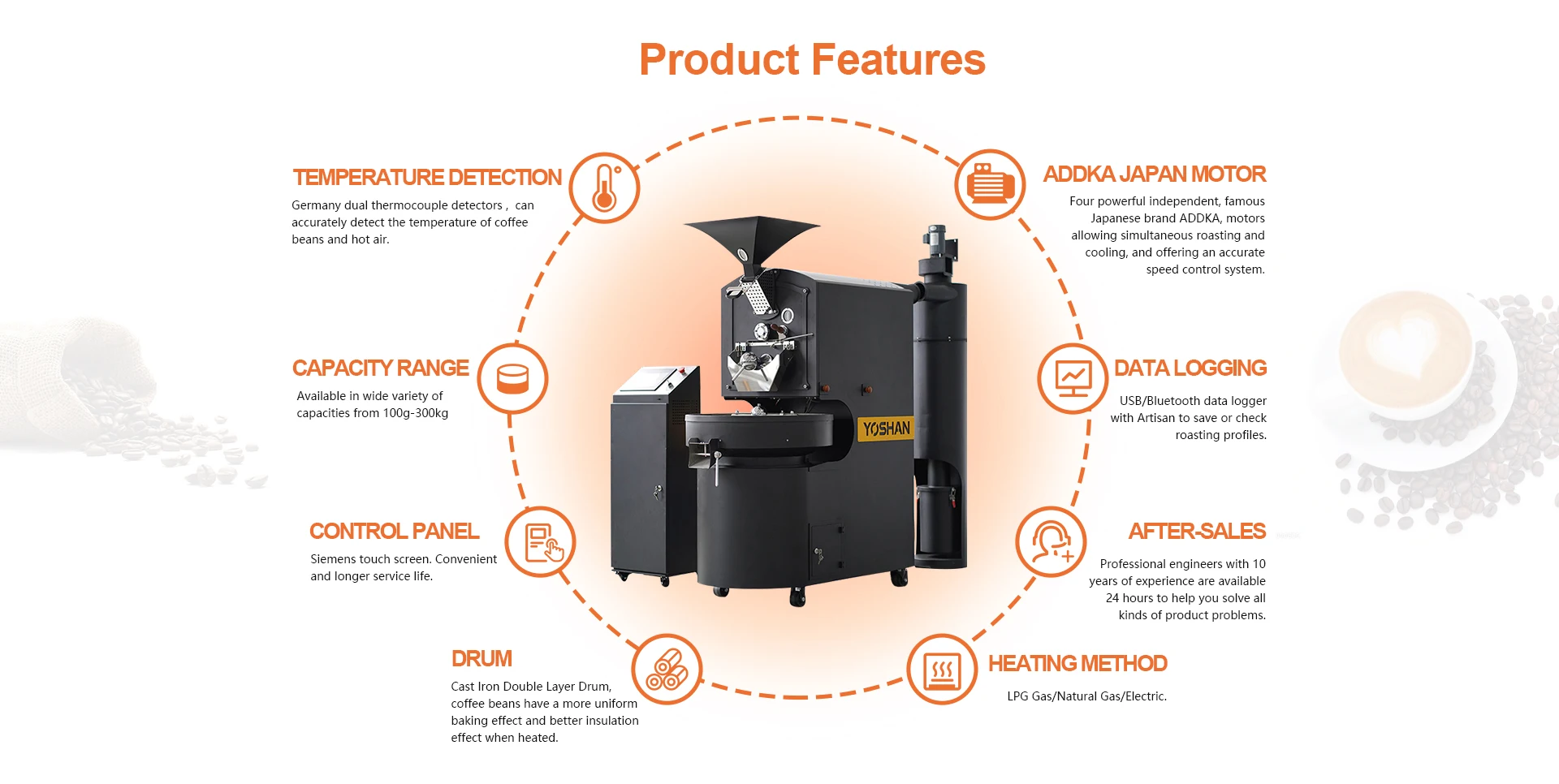 German technology makes top-end quality, YOSHAN is the only one who could manufacture the full automatic coffee roaster which temperature difference is controlled within ±0.1 during the temperature chasing process